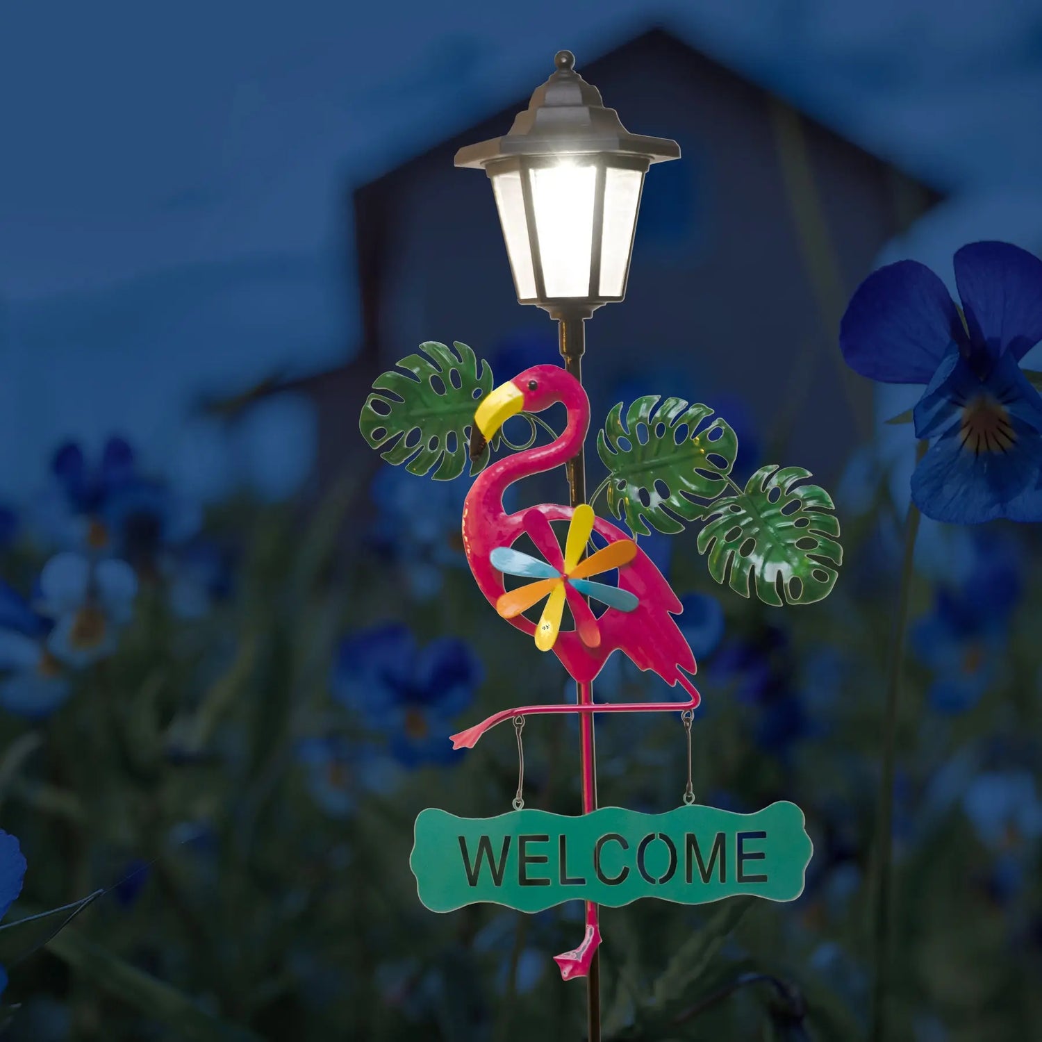 Frog and Flamingo Welcome Sign Solar Garden Stake