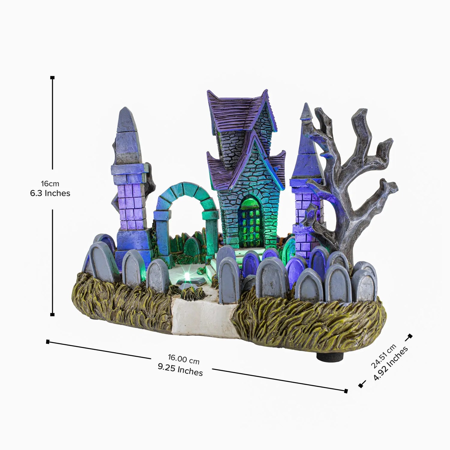 Enhance your collection with the haunting ambiance of Cemetery Yard Halloween Village, a must-have accessory for collectors seeking to add a touch of eerie elegance to their displays. This polyresin cemetery scene features colorful LED lights that cast an otherworldly glow over the tombstones and gravestones, creating a chilling atmosphere that is sure to captivate and inspire. Measuring 9.25 inches in width, 4.92 inches in depth, and 6.3 inches in height, Cemetery Yard is the perfect addition to any collector's showcase.