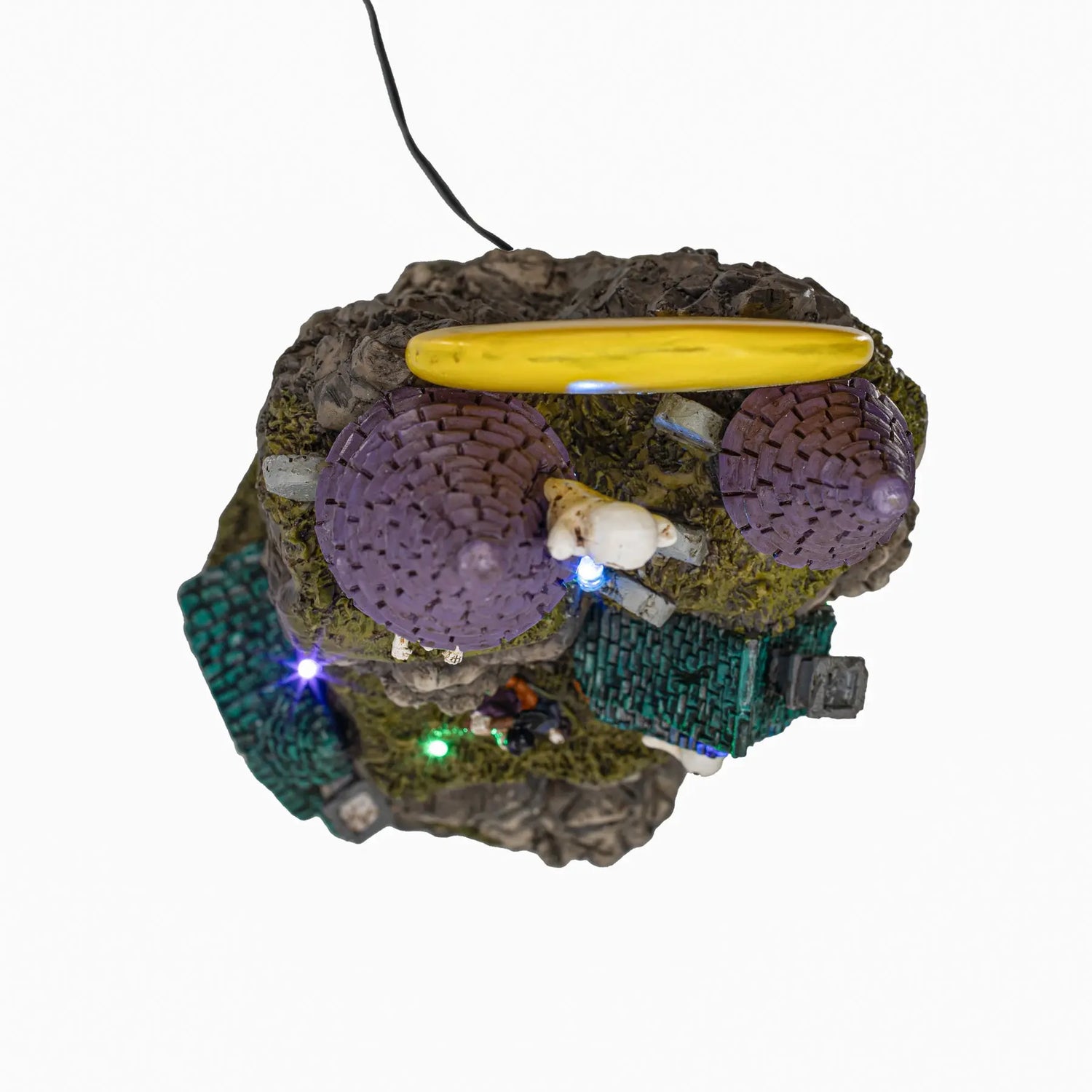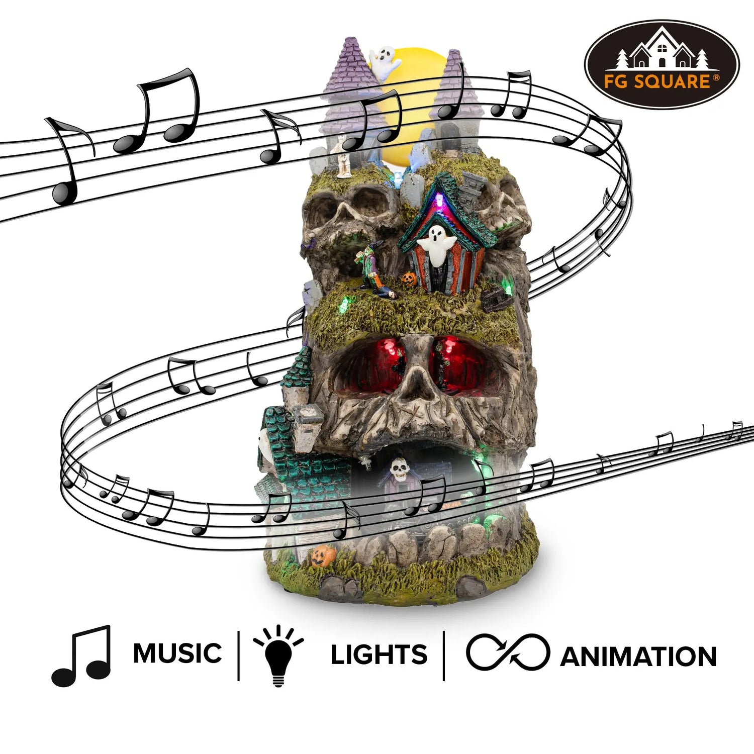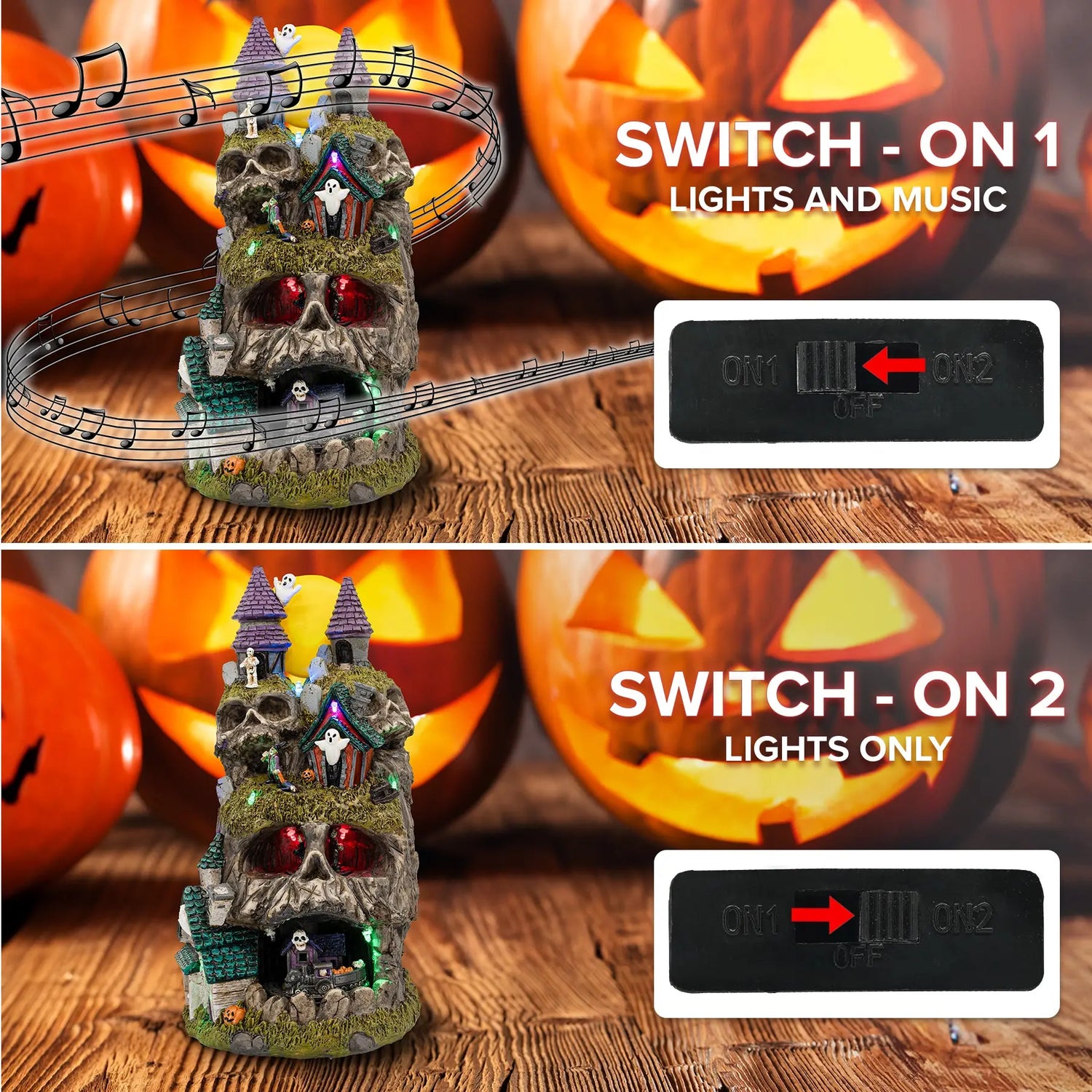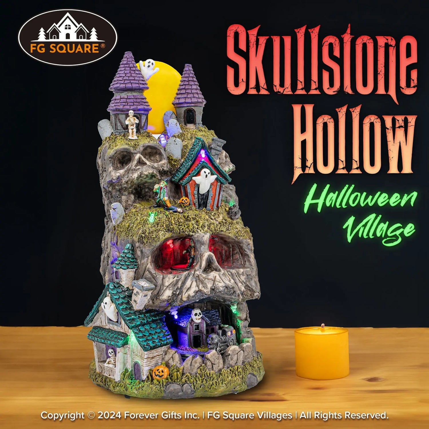 Dive into the eerie allure of Skullstone Hollow Halloween Village, an exquisite piece that seamlessly blends gothic charm with intricate craftsmanship. This striking décor item is perfect for those who revel in the macabre and appreciate unique, eye-catching design. Featuring an animated train, ghosts, witches, and more, made from high-quality resin, Skullstone Hollow features a hauntingly realistic skull with meticulously detailed engravings, evoking the essence of ancient relics and forgotten tales.